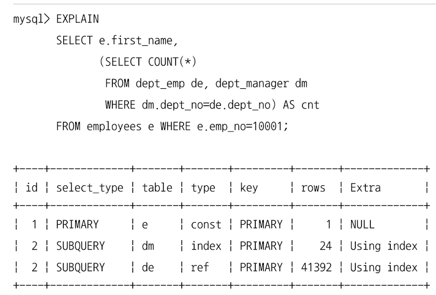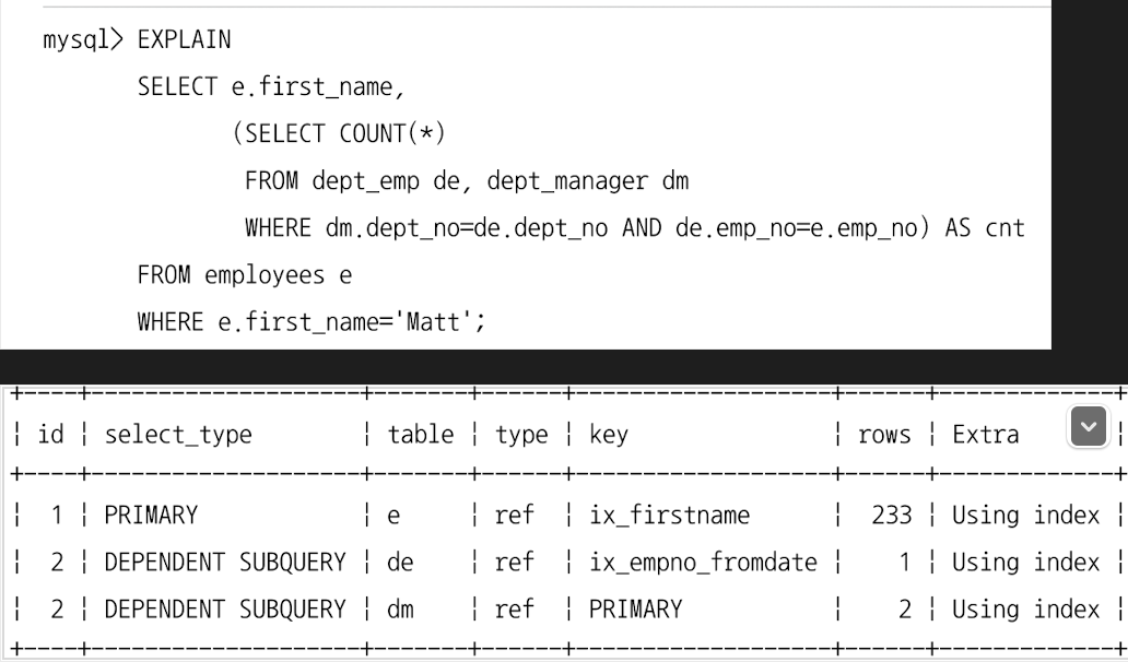 - DEPENDENT SUBQUERY는 의존하는 바깥쪽(Outer) 쿼리의 칼럼의 값 단위로 캐시해두고 사용한다.