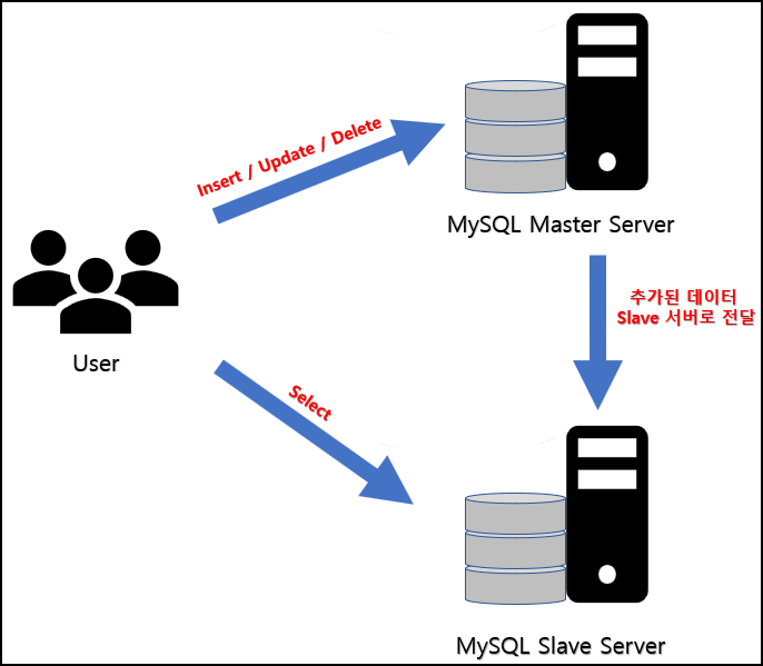 - 아래의 그림으로 표현한다면 Master 서버를 등록/수정/삭제를 사용하는 서버로 사용하고, Slave 서버를 데이터를 읽는용도로 사용하게 되면 DBMS의 부하를 분산하는 용도로 사용