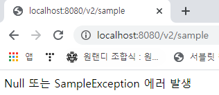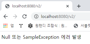@RestController @RequiredArgsConstructor public class ExceptionHandlerController2 { private final ExceptionHandlerService service; @GetMapping("/v2") public ResponseEntity playNullPointException(){ return new ResponseEntity<>(service.nullPointExceptionError(), HttpStatus.OK); } @GetMapping("/v2/sample") public ResponseEntity playSampleException(){ return new ResponseEntity<>(service.sampleException(), HttpStatus.OK); } @ExceptionHandler({NullPointException.class, SampleException.class}) public String nullPointExceptionHandler(){ return "Null 또는 SampleException 에러 발생"; } }ExceptionHandlerService