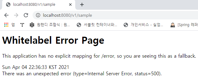 ExceptionHandlerController와 ExceptionHandlerController2의 코드를 보게 된다면 SampleException를 처리 했냐 안했냐의 차이점이 존재한다. 이를 기억하고 코드를 실행시키면 실행결과가 아래와 같이 발생이 된다.